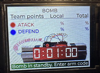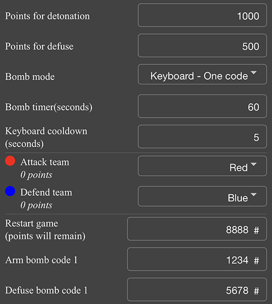 <table><thead><tr><th width="166">Parameter</th><th>Description</th></tr></thead><tbody><tr><td>Points for detonation</td><td>How many point gets the attack team if the bombs detonates</td></tr><tr><td>Points for defuse</td><td>How many point gets the defend team if the the bombs is defused</td></tr><tr><td>Bomb mode</td><td>Keyboard - One code: Use just one code per arm/defuse<br>Keyboard - Two codes: Use two codes to fully arm the bomb, or fully defuse it.</td></tr><tr><td>Bomb timer<br>(seconds)</td><td>Bomb timer in seconds</td></tr><tr><td>Keyboard cooldown <br>(seconds)</td><td>Set a cooldown period for typing codes. Combined with two codes for arm/defuse you can force the players to stay a longer period around the box.</td></tr><tr><td>Attack/Defend<br>teams</td><td>Select the attack and defend teams</td></tr><tr><td>Restart game<br>code</td><td>Used by Game Master to reset the bomb to unarmed state. Points scored by teams from the previous rounds will still counts.</td></tr><tr><td>Arm bomb code 1/2</td><td>Arm code(s)</td></tr><tr><td>Defuse bomb <br>code 1/2</td><td>Defuse code(s)</td></tr></tbody></table>
